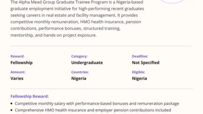 Alpha Mead Group Graduate Trainee Programme offers Nigerian graduates with a strong foundation for professional career in real estate and facilities management and property development. It is for the brightest graduates who are ready to undertake and gain empirical knowledge in a fast-growing and well-organized field.