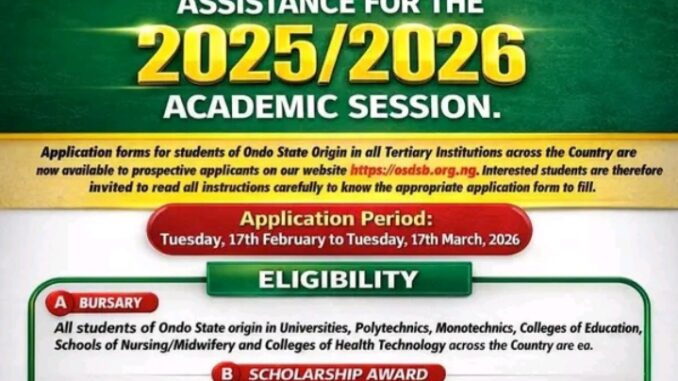 Submission of applications commenced from 17th February to 17th March, 2026 through the Ondo State Scholarship Board website at https://osdsb.org.ng.