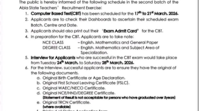 The Abia State Ministry of Basic and Secondary Education wishes to inform candidates and the general public the following schedule in the second batch of the Abia State Teachers’ Recruitment Exercise: