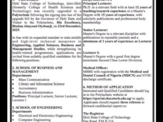 Apply for EKSCOTECH Ijero-Ekiti 2026 Job Recruitment The Ekiti State College of Technology, Ijero-Ekiti (formerly College of Health Sciences and Technology) was transformed into a Polytechnic on 23rd December, 2025 by the state governor Biodun […]