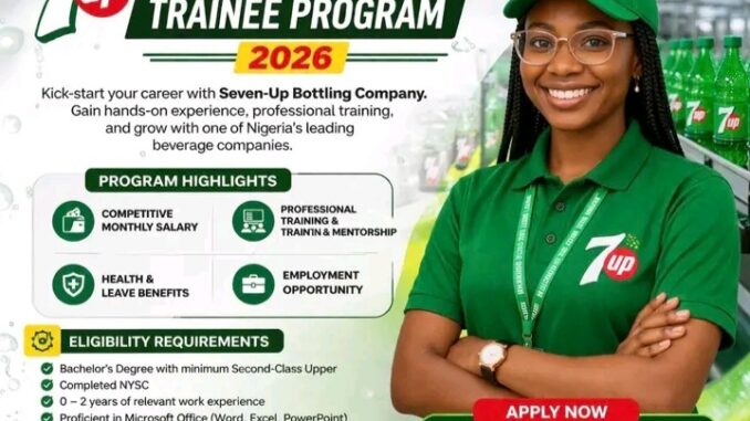 The Seven Up Bottling Company Limited has opened applications for its 2026 Graduate Trainee Program, providing young Nigerian graduates with a paid opportunity to gain practical skills and real work experience in the manufacturing and FMCG sector. It is a path for fresh graduates to enter into one of Nigeria’s well established companies in the beverages line of business.